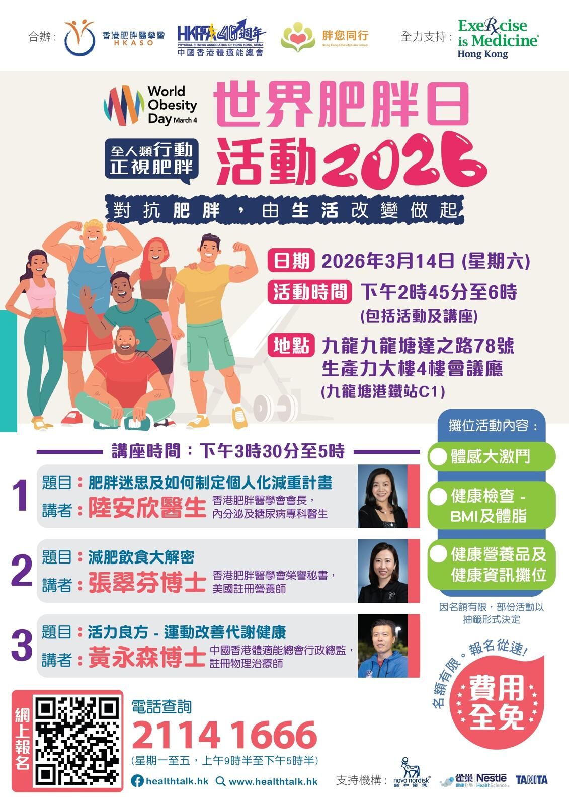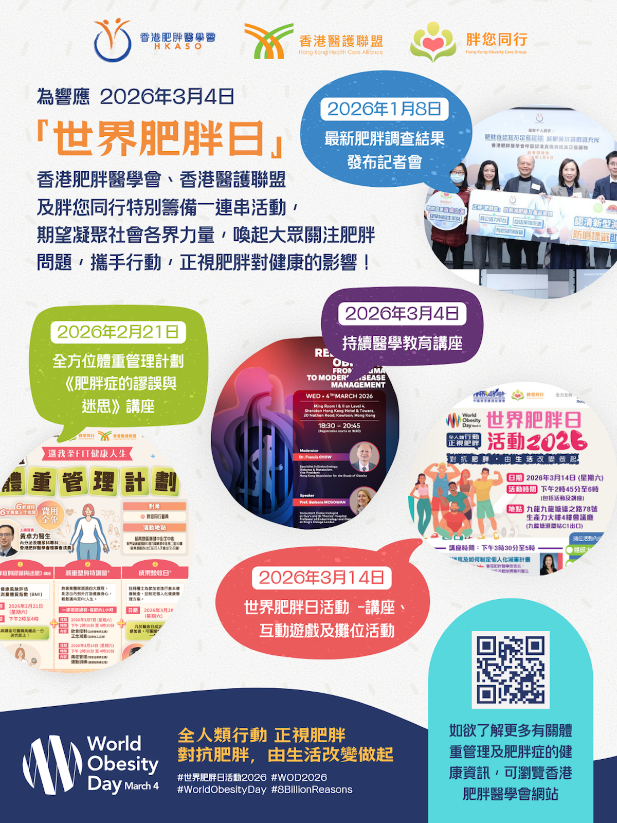 為響應 2026年3月4日「世界肥胖日」,香港肥胖醫學會、香港醫護聯盟及胖您同行特別籌備一連串活動,凝聚社會各界力量喚起大眾關注肥胖問題,攜手行動,正視肥胖對健康帶來的深遠影響。
